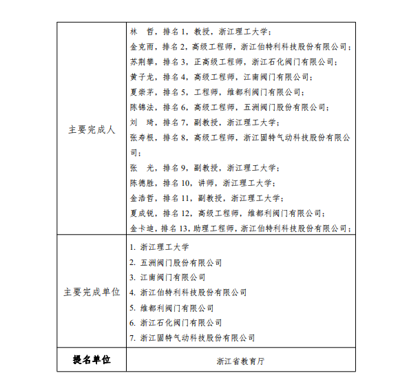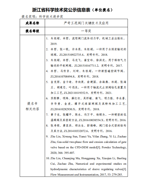 根據(jù)《浙江省科學(xué)技術(shù)廳關(guān)于開展2021年度浙江省科學(xué)技術(shù)獎提名工作的通知》要求,現(xiàn)對我單位擬參與申報的浙江省科技獎勵項(xiàng)目“嚴(yán)苛工況閥門關(guān)鍵技術(shù)及應(yīng)用”予以公示,公示期7天(2022年2月26日至2022年3月4日)。