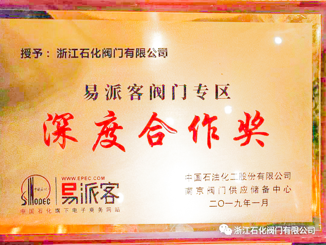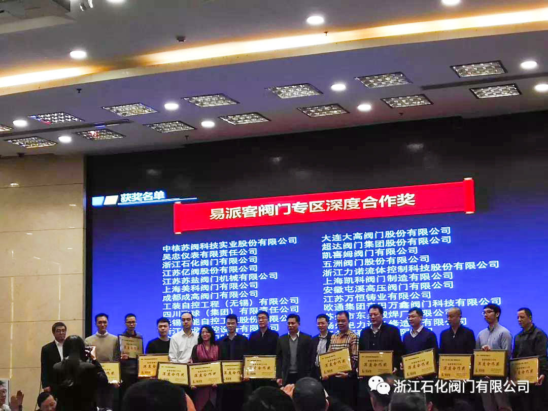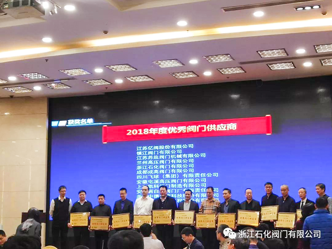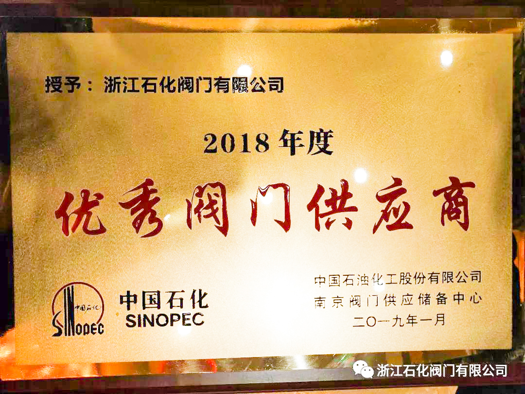 2019年1月11日,中國石油化工股份有限公司南京儲備中心、中國石化國際事業(yè)有限公司南京招標中心、中石化國際事業(yè)南京有限公司在南京組織召開易派客閥門專區(qū)推進會暨閥門供應商年度總結會。浙江石化閥門有限公司憑借過硬的產(chǎn)品質量、完善的服務體系榮獲了“2018年度中國石化優(yōu)秀閥門供應商”、“易派客閥門專區(qū)深度合作獎”的兩項榮譽。該榮譽的取得,是中國石化對浙江石化閥門的充分認可。
