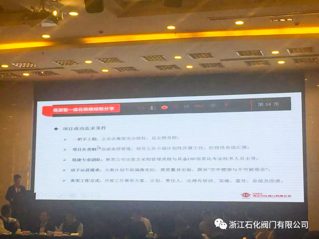 作為最早進入易派客平臺的閥門企業(yè),浙江石化閥門積極響應中石化推進基于互聯(lián)網(wǎng)+的供應鏈管理創(chuàng)新要求,從采購、銷售等環(huán)節(jié)和中石化易派客進行了深度的合作,從而使公司的ERP和易派客能夠互聯(lián)互通。會上公司被邀請分享了易派客一體化連接經(jīng)驗。